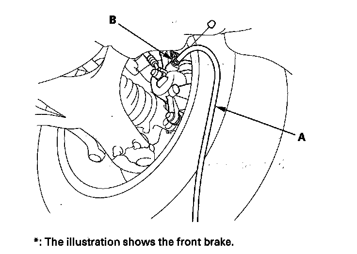 3. Attach a length of drain tube (A) to the bleed screw (B) on the caliper or wheel cylinder.