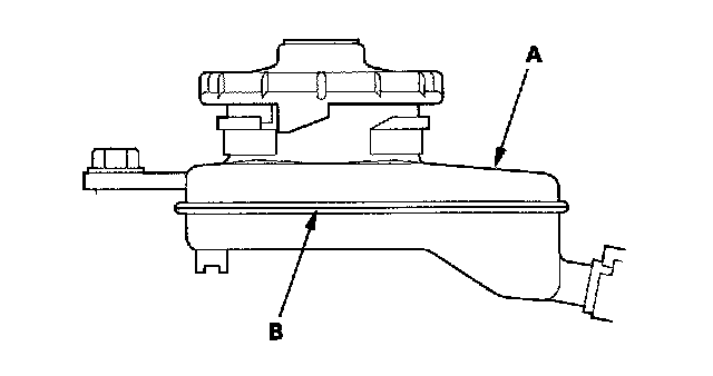 5. Check that the brake fluid level in the reservoir is at the MAX (upper) level line (B).