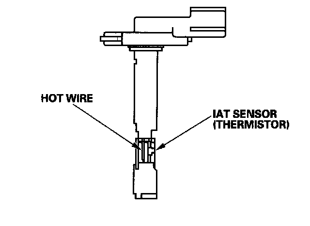 Mass Air Flow (MAF) Sensor/Intake Air Temperature (IAT) SensorThe mass air flow (MAF) sensor/intake air temperature (IAT) sensor contains a hot wire and a thermistor. It is located in the intake air passage. The resistance of the hot wire and thermistor changes due to intake air temperature and air flow. The control circuit in the MAF sensor controls the current to keep the hot wire at a set temperature. The current is converted to voltage in the control circuit, then output to the PCM.