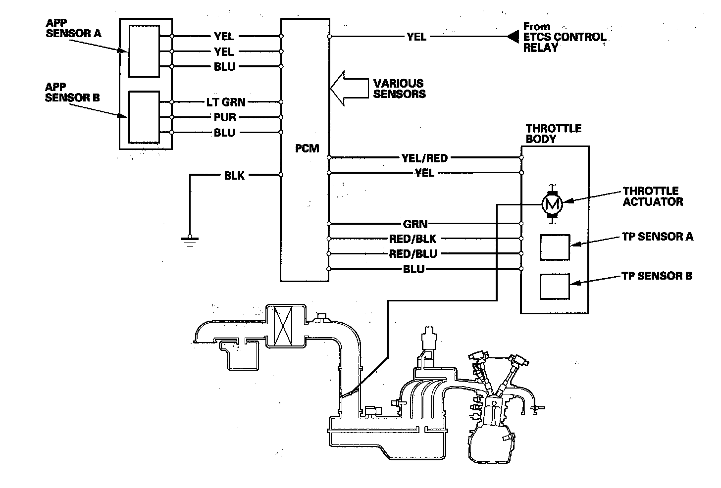 Electronic Throttle Control System DiagramThe electronic throttle control system consists of the throttle actuator, throttle position (TP) sensor A/B, accelerator pedal position (APP) sensor A/B, the electronic throttle control system (ETCS) control relay, and the PCM.