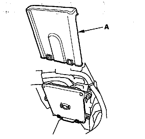 4. Remove the coolant reservoir (E). Disconnect PCM connectors A, B, and C.