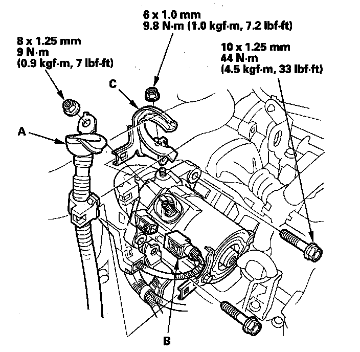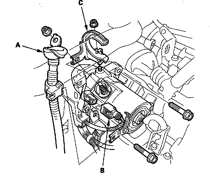6. Disconnect the starter cable (A) from the B terminal and the BLK/WHT harness connector (B) from the S terminal, then remove the upper radiator hose bracket (C).