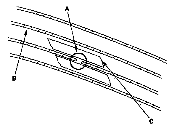 2. Carefully mask above and below the broken portion of the defogger wire (B) with cellophane tape (C).