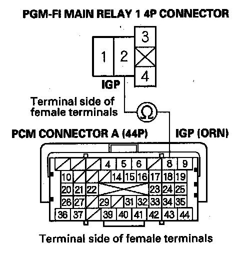 61. Check for continuity between PGM-FI main relay 1 4P connector terminal No.4 and PCM connector terminal A6.