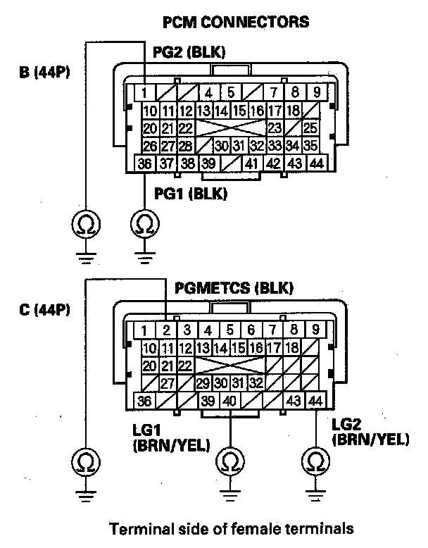70. Check for continuity between body ground and PCM connector terminals I, B36, C2, C40, and C44 individually.