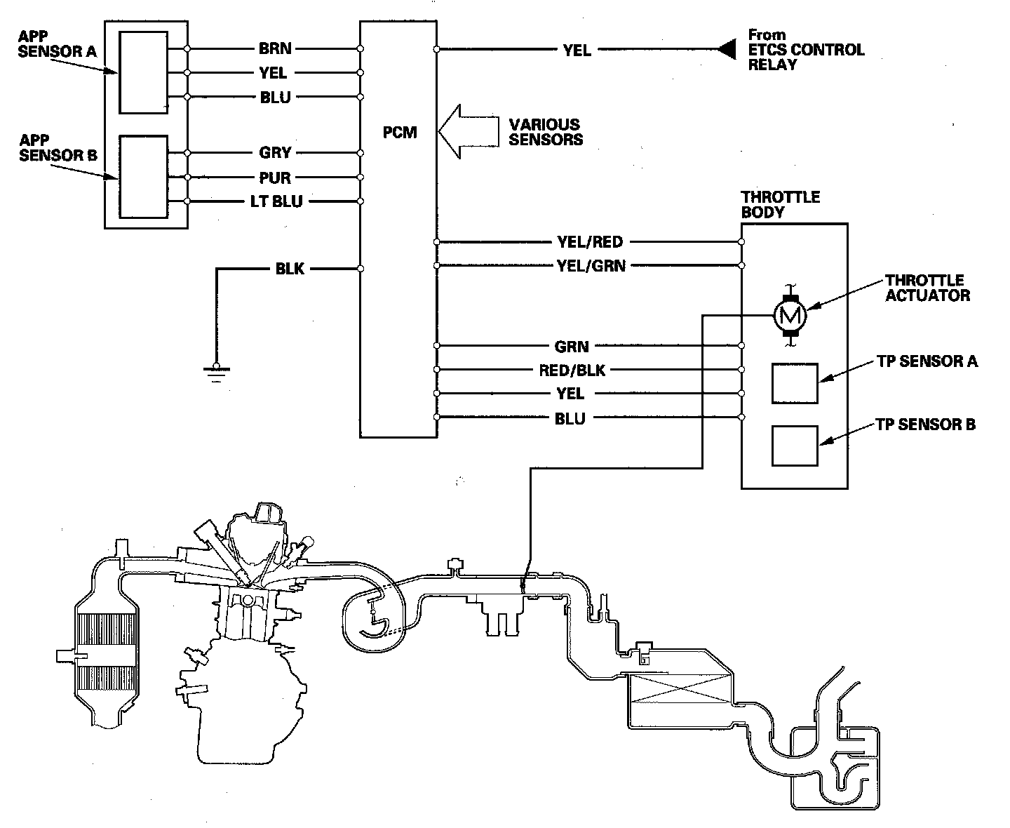 Electronic Throttle Control System DiagramThe electronic throttle control system consists of the throttle actuator, throttle position (TP) sensor A/B, accelerator pedal position (APP) sensor A/B, the electronic throttle control system (ETCS) control relay, and the PCM.