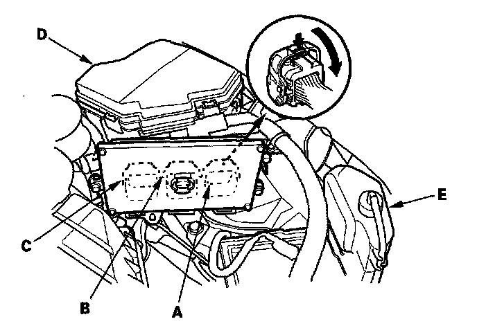 4. Remove the coolant reservoir (E). Disconnect PCM connectors A, B, and C.
