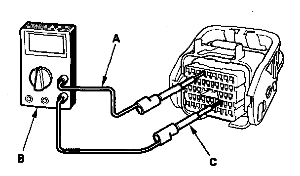 6. Connect one side of the patch cord (A) terminals to a commercially available digital multimeter (B), and connect the other side of the patch cord terminals to a commercially available banana jack (Pomona Electronics Tool No. 3563 or equivalent) (C).