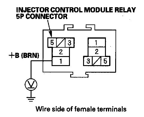 8. Measure voltage between injector control module relay 5P connector terminal No. 1 and body ground.