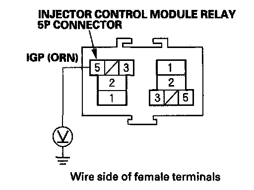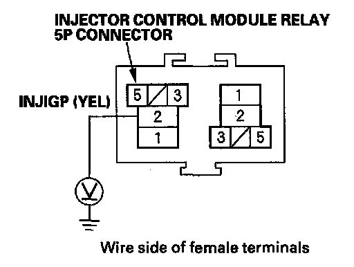 15. Measure voltage between injector control module relay 5P connector terminal No. 2 and body ground.