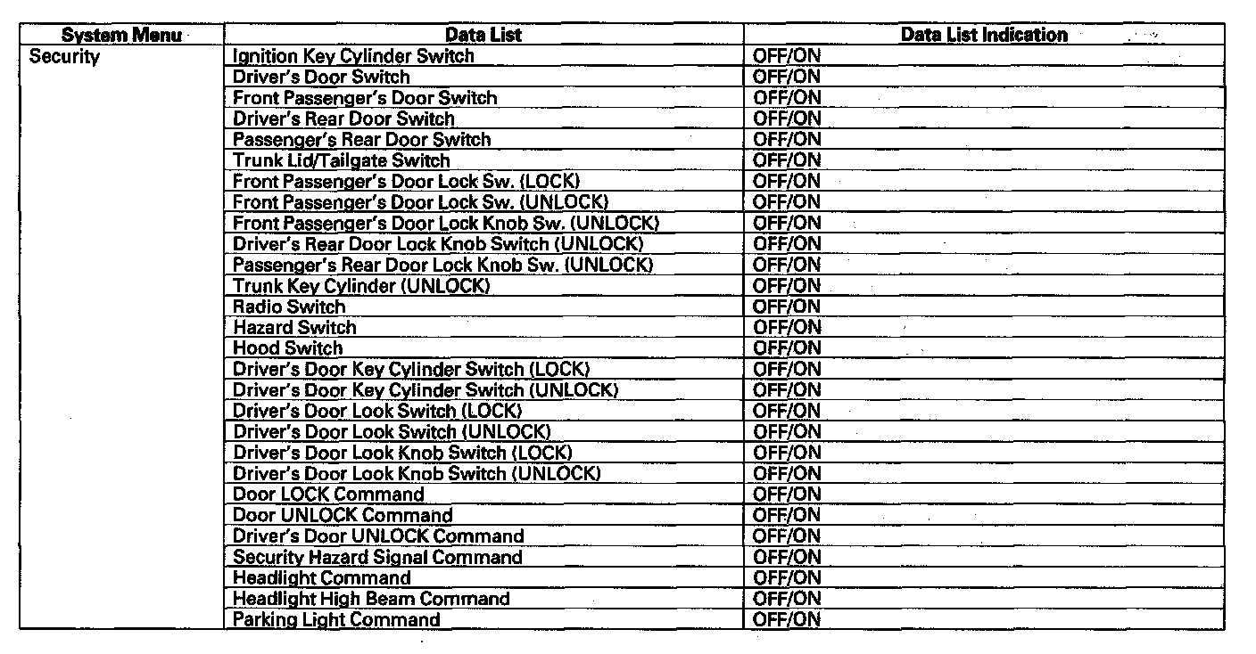 By connecting the HDS to the data link connector (DLC), the HDS can retrieve the diagnostic results from the MICU via a diagnostic line called K-LINE. The K-LINE is distinguished from the CAN line, and connected to the CAN related ECUs. The MICU is a gateway between the HDS and B-CAN related ECUs, and sends B-CAN diagnostic results to the HDS. When performing a function test with the HDS, the HDS sends an output signal through the K-LINE to the MICU. The MICU either relays the request to another ECU, or commands the function its self.