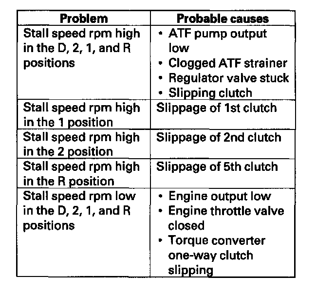 9. If the stall speeds are out of the service limit, problems and probable causes are listed in the table.