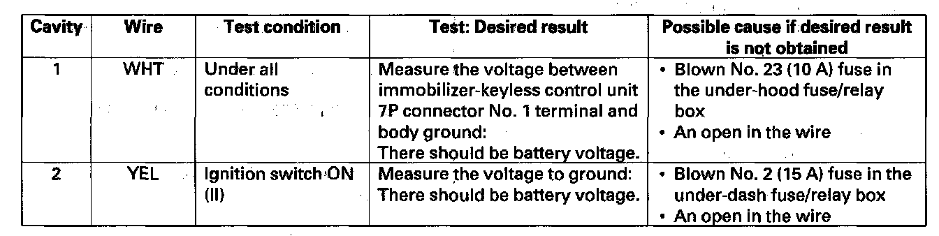 Immobilizer-keyless Control Unit Input TestNOTE: Before testing the immobilizer system, troubleshoot the system using B-CAN System Diagnosis Test Mode A and check the No. 10 (7.5 A) and No. 38 (30 A) fuses in the under-dash fuse/relay box.