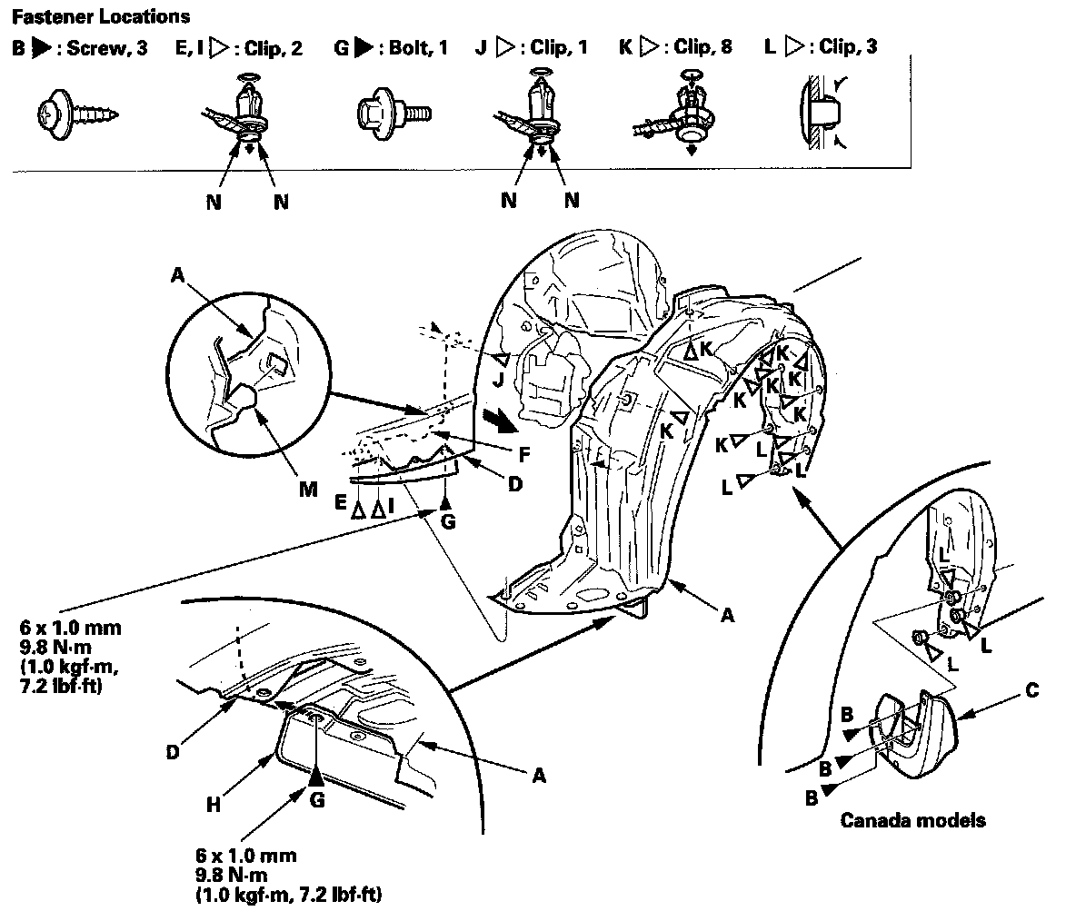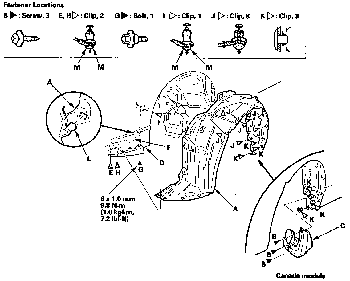3. From the wheel arch, remove the clips (J, K, L) securing the front inner fender (and splash shield) to the body.