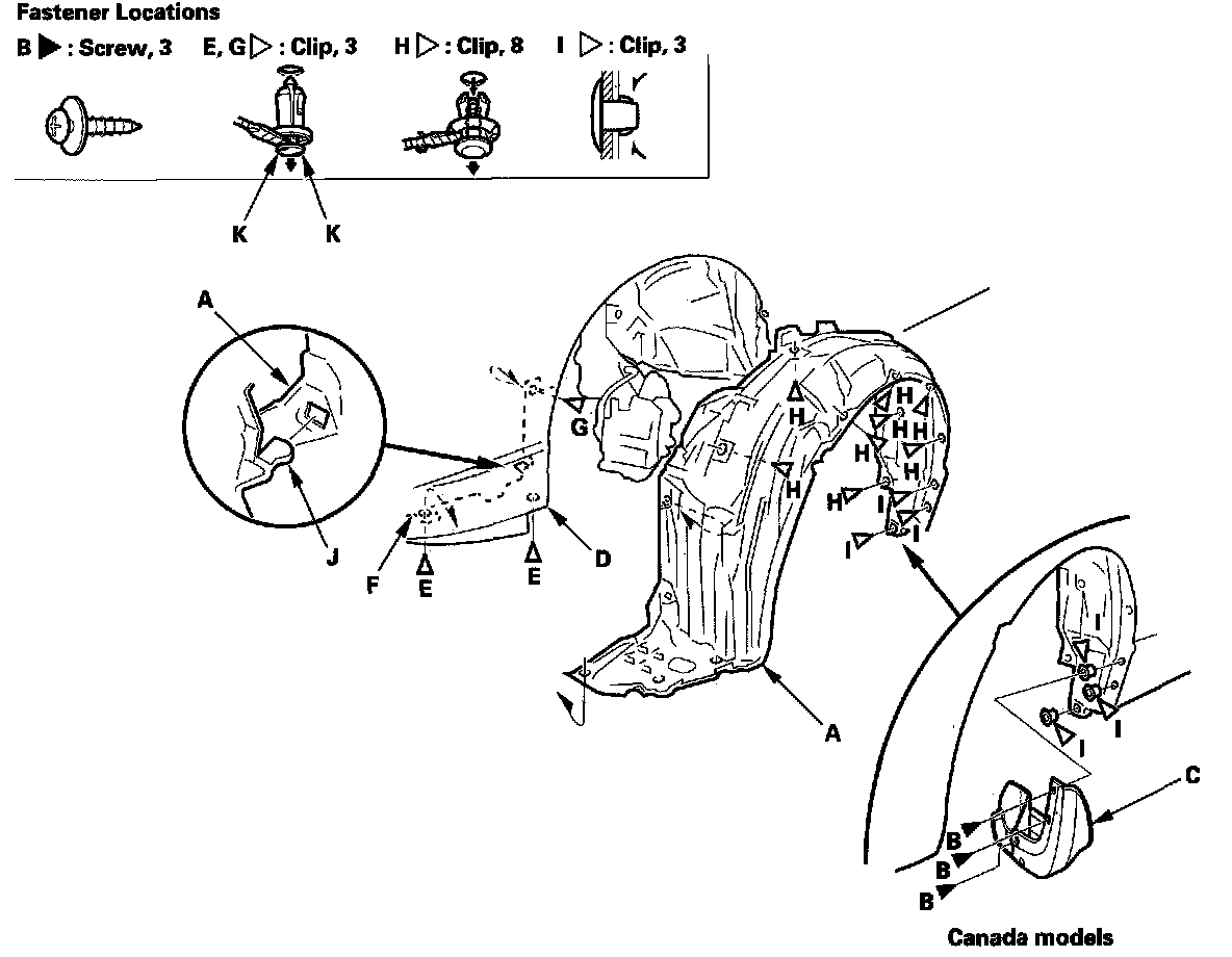 3. From the wheel arch, remove the clips (I, J, K) securing the front inner fender (and splash shield) to the body.