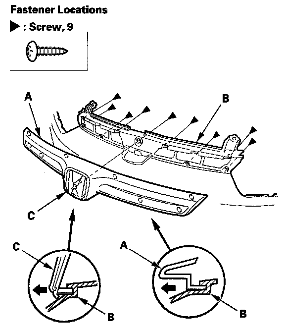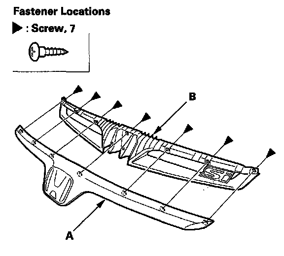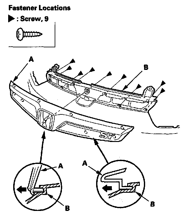 2. Remove the screws, and remove the front grille (A) from the front bumper (B).