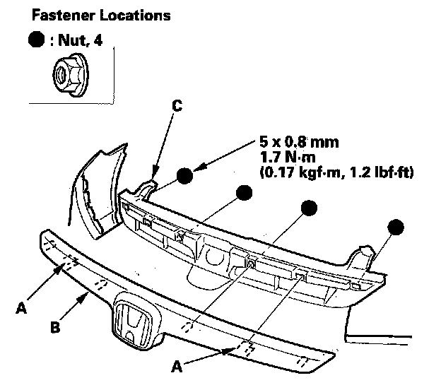 2. Remove the nuts, and release the hooks (A), then remove the front grille (B) from the front bumper (C).