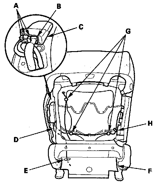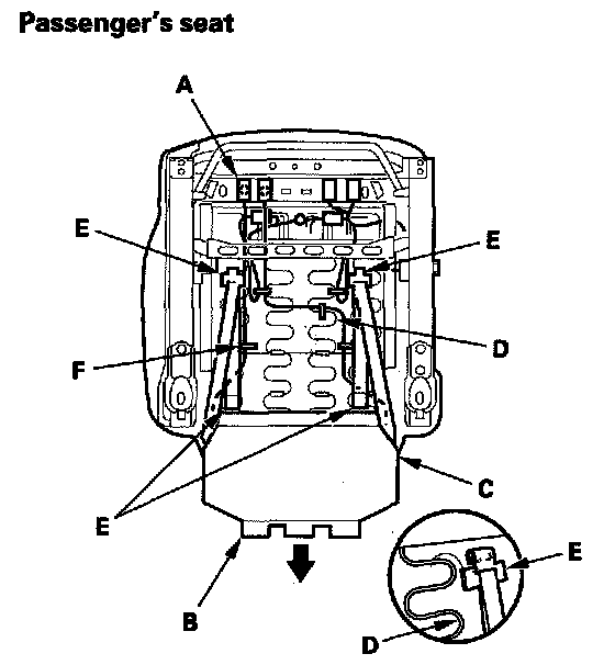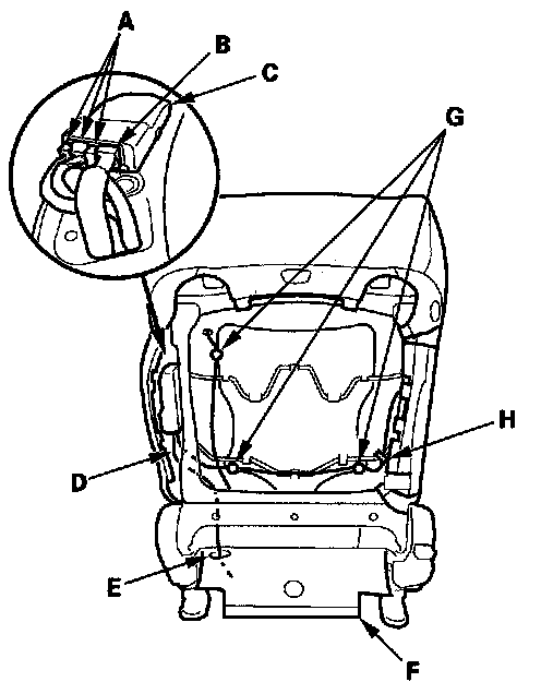 11. Passenger's seat: Disconnect the ODS sensor connectors (A) and ODS subharness connector (B) from the ODS unit (C), and pull them out through the hole in the seat frame. Pull the ODS subharness (D) out through the harness hole (E) in the seat-back cover (F). Detach the harness clips (G) and remove the wire tie (H).