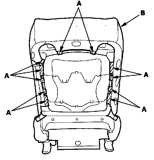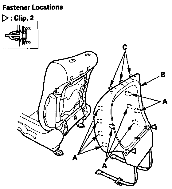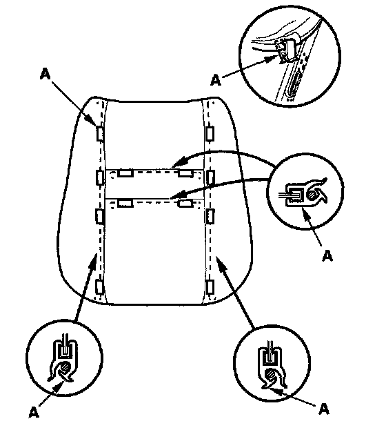 14. Except Si model: Pull back the edge of the seat-back cover all the way around, and release the clips (A), then remove the seat-back cover.