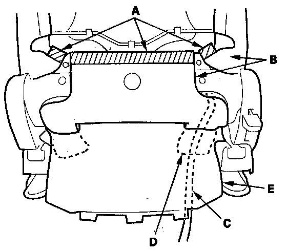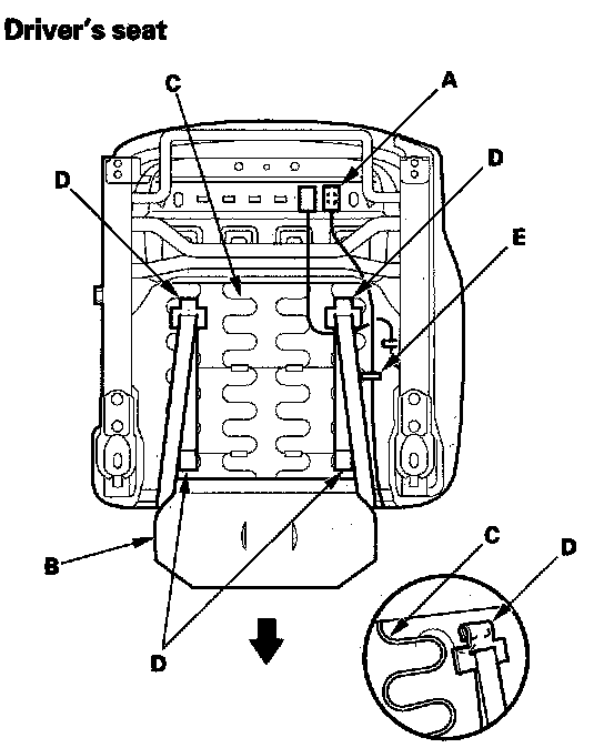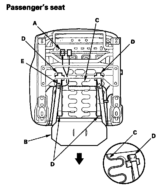 - Before installing the side airbag (C), make sure the reinforcing cloth (D) is fixed on the seat-back frame (E) securely.