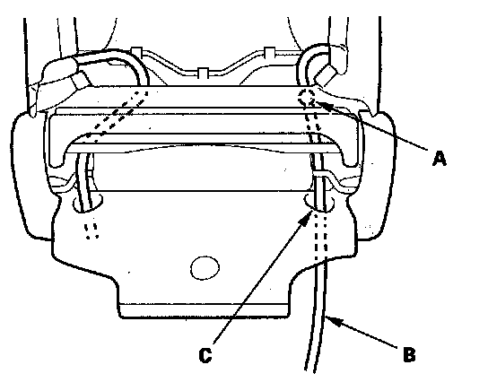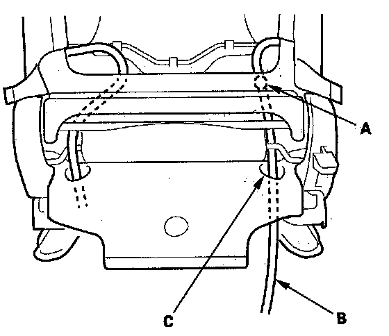 7. Detach the harness clip (A), and pull the side airbag harness (B) out through the harness hole (C) in the seat-back cover and seat frame. Passenger's seat is shown; driver's seat is similar.