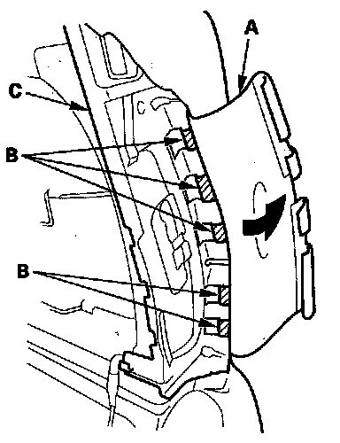 10. Turn over the reinforcing cloth (A), then release the hooks (B) from the side airbag module holder (C). Passenger's seat is shown; driver's seat is similar.