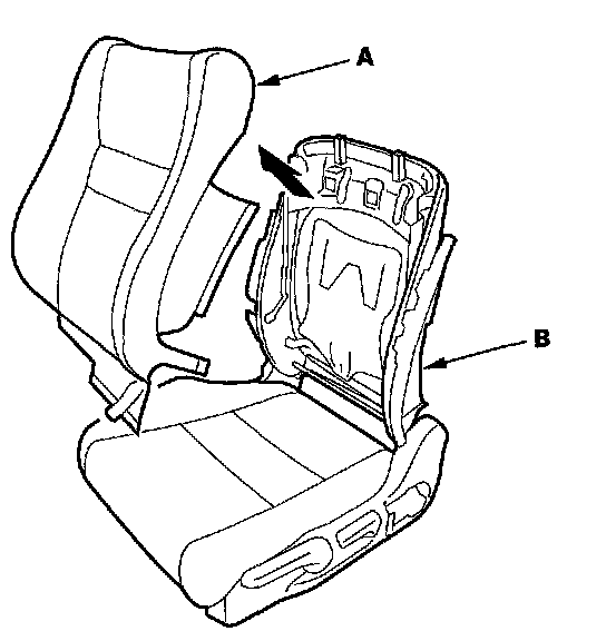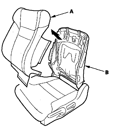 9. Release the hook strips (A), then loosen the seat-back cover (B). Driver's seat is shown; passenger's seat is similar.
