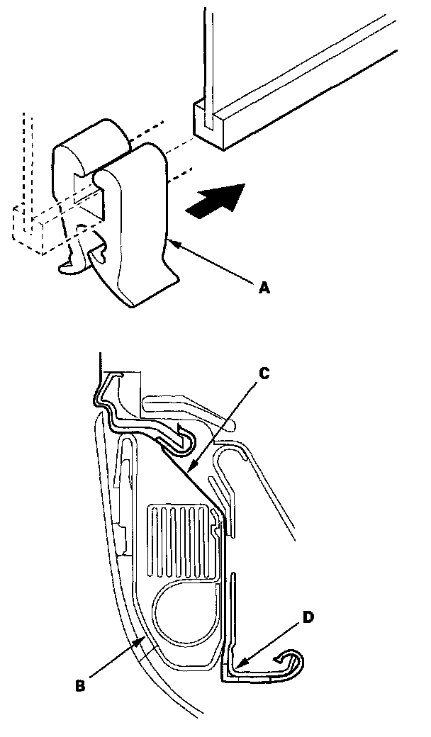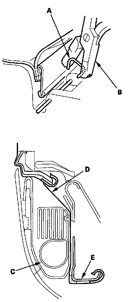 - Replace any clips (A) you removed with new ones. Install them with commercially available upholstery ring pliers (B).