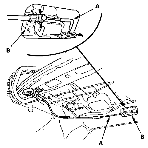 2. From the trunk, disconnect the seat-back release cable (A) from the seat-back latch (B).