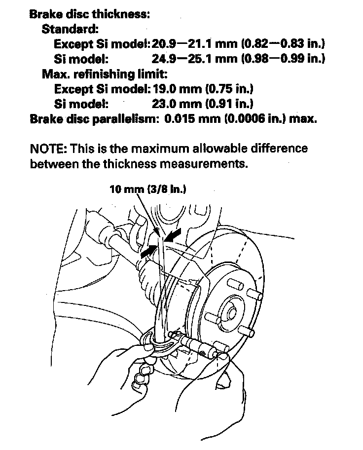 ^ A new brake disc should be refinished if its runout is greater than 0.04 mm (0.0016 in.).