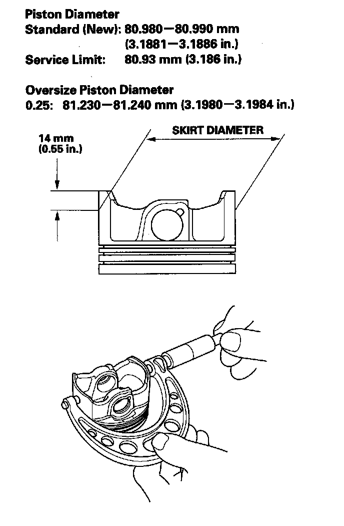 3. Measure the piston diameter at a point 14 mm (0.55 in.) from the bottom of the skirt.