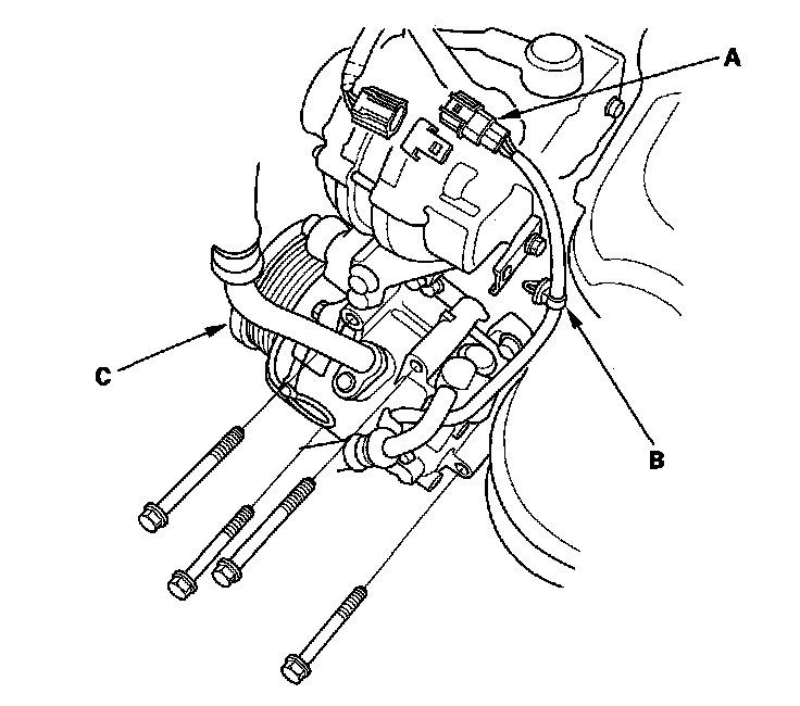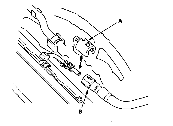 39. Disconnect the A/C compressor clutch connector (A), then remove the harness clamp (B).