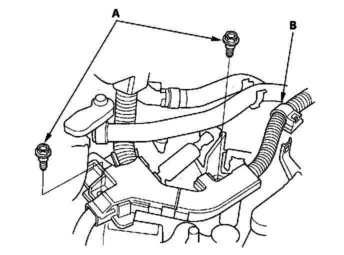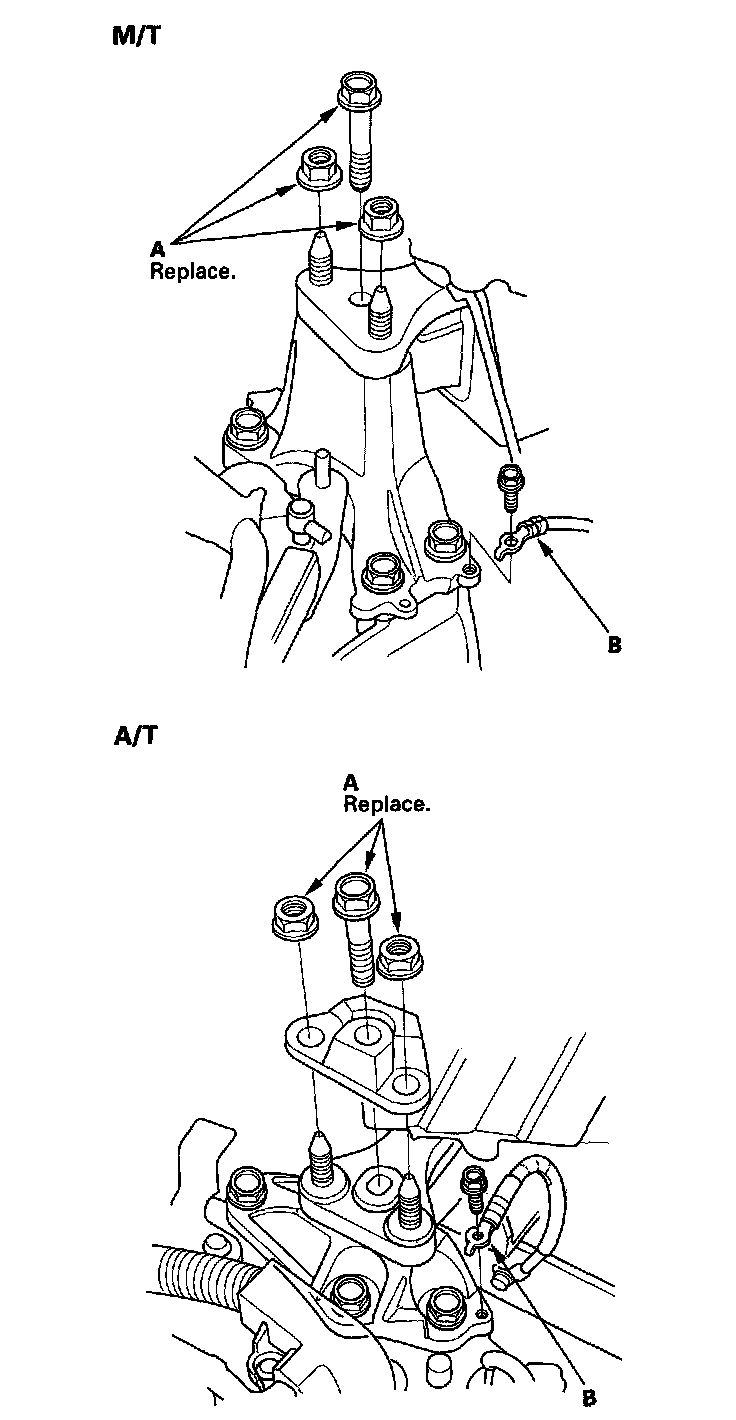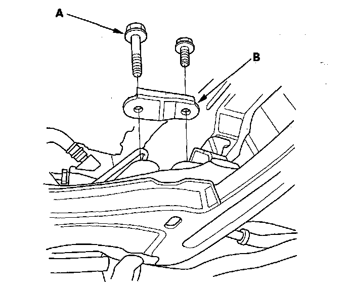 16. M/T model: Remove the two bolts (A) securing the harness holder, then remove the harness clamp (B).