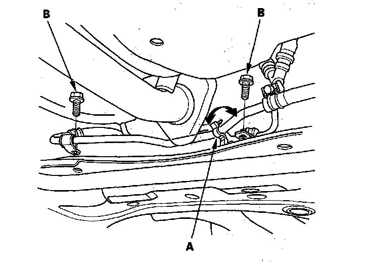 33. Unclamp the power steering fluid line clamp (A) on the front subframe, and remove the P/S line mounting bolts (B).