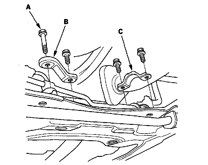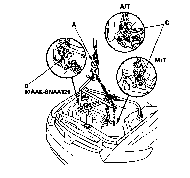 54. Attach a chain hoist (A) to the universal eyelet (B) and transmission hook (C). Lift up on the engine/transmission until it's securely supported by the chain hoist, and remove the engine support hanger from the engine and vehicle.