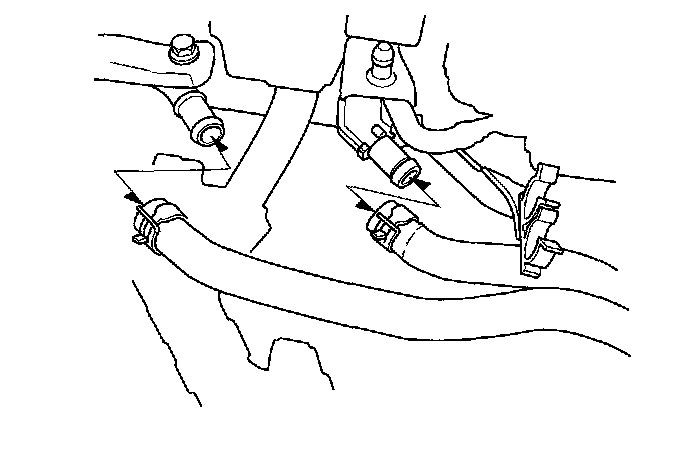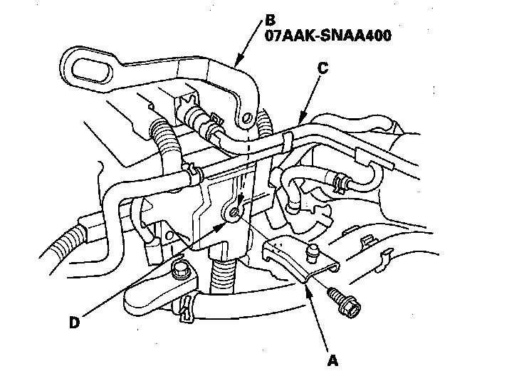 10. Disconnect the evaporative emission (EVAP) canister hose (A), brake booster vacuum hose (B), and power steering (P/S) hose clamp (C).