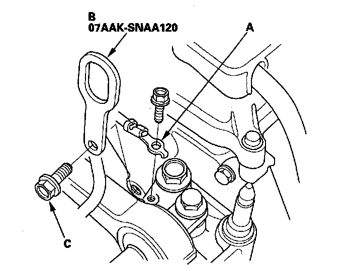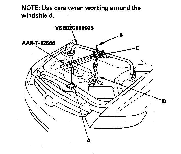 44. Install the front leg assembly (A), hook (B), and wing nut (C) from an A and Reds engine support hanger (AAR-T-1 2566) onto the 2006 civic engine hanger. Carefully position the engine hanger on the vehicle, and attach the hook to the slotted hole in the support eyelet (D). Tighten the wing nut by hand to lift and support the engine/transmission.