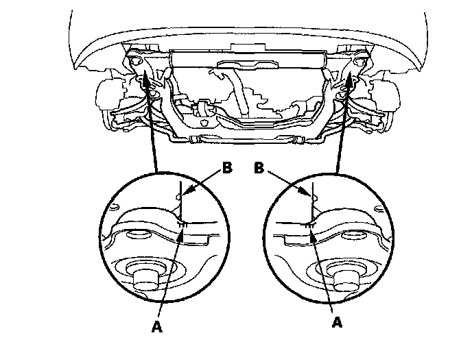 47. Note the reference marks (A) on both sides of the front subframe that line up with the body (B).