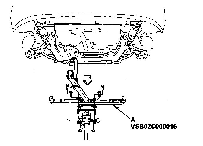 49. Attach the front subframe adapter (A) to the front subframe and hang the belt of the front subframe adapter over the front of the subframe, then secure the belt with its stop.