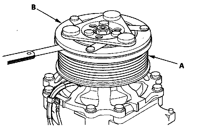 3. Measure the clearance between the rotor pulley (A) and the armature plate (B) all the way around. If the clearance is not within specified limits, remove the armature plate and add or remove shims as needed to increase or decrease clearance.