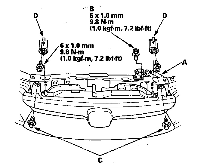 7. Remove the reservoir hose (A), radiator cap base mounting bolts (B), clips (C), and radiator upper brackets (D).