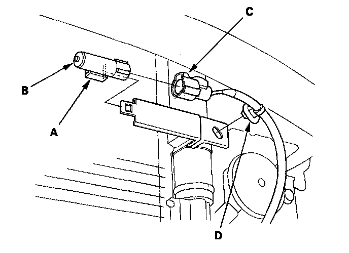 6. Lift the tab (A) to release the lock, then remove the outside air temperature sensor (B) from the receiver/dryer desiccant bracket. Disconnect the 2P connector (C), then remove the clip (D).