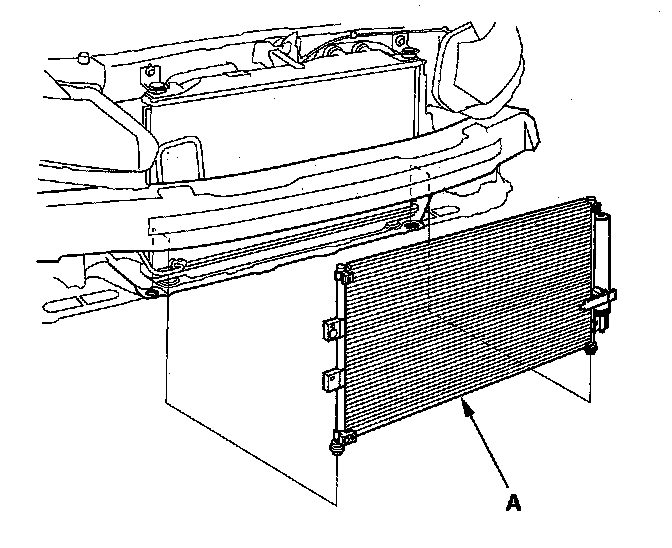 7. Remove the A/C condenser (A). Be careful not to damage the radiator and A/C condenser fins when removing the A/C condenser.