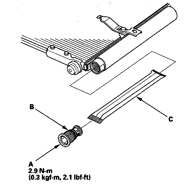 2. Remove the cap (A) from the bottom of the A/C condenser. Remove the O-rings (B) and the desiccant (C).