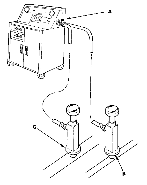 2. Connect an R-134a refrigerant recovery/recycling/charging station (A) to the high-pressure service port (B) and the low-pressure service port (C), as shown, following the equipment manufacturer's instructions. Evacuate the system.