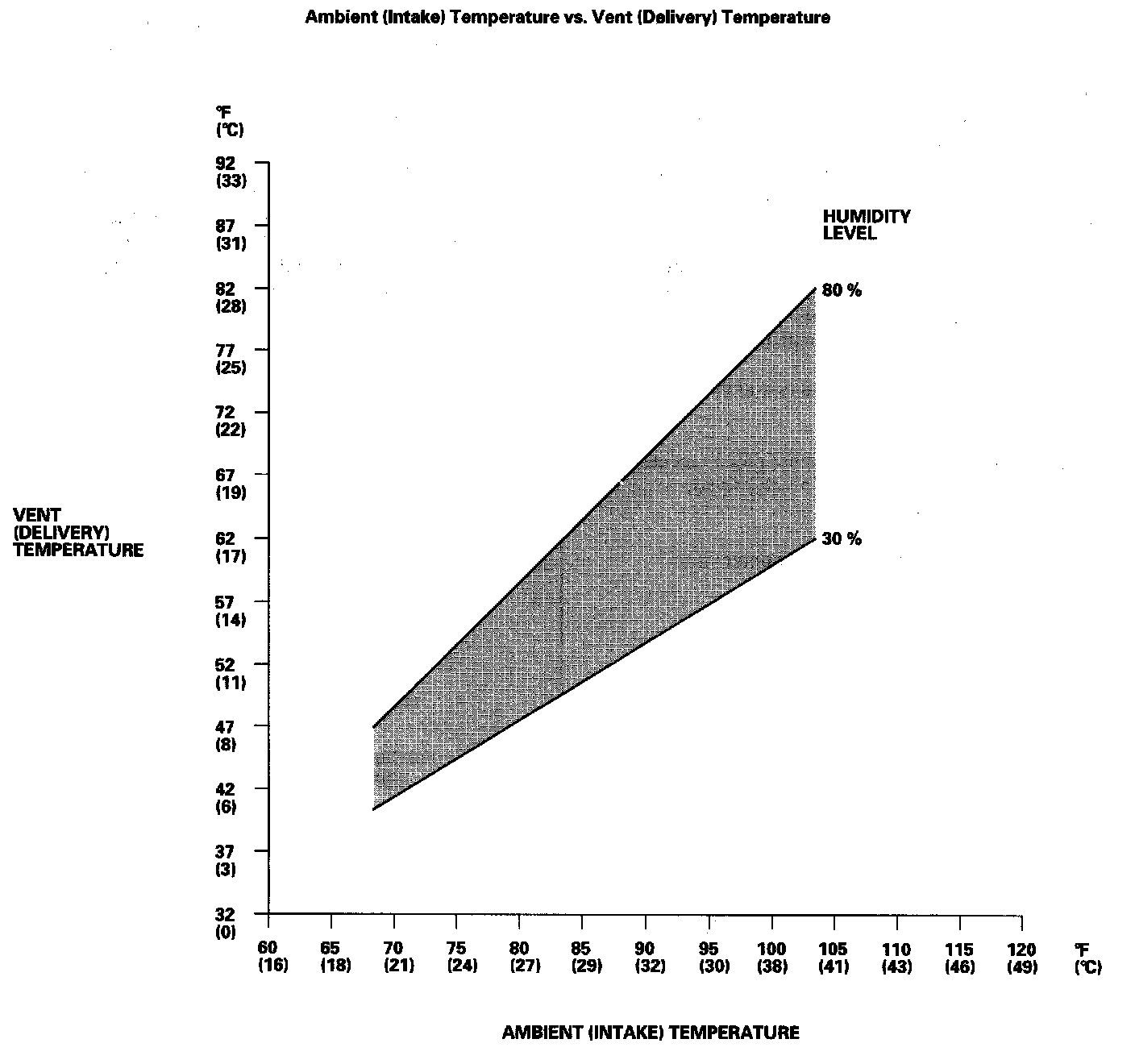 NOTE: The low side and intake temperatures should intersect in the shaded area within about 10 % of the measured humidity level. Any measurements outside the line may indicate the need for further inspection.