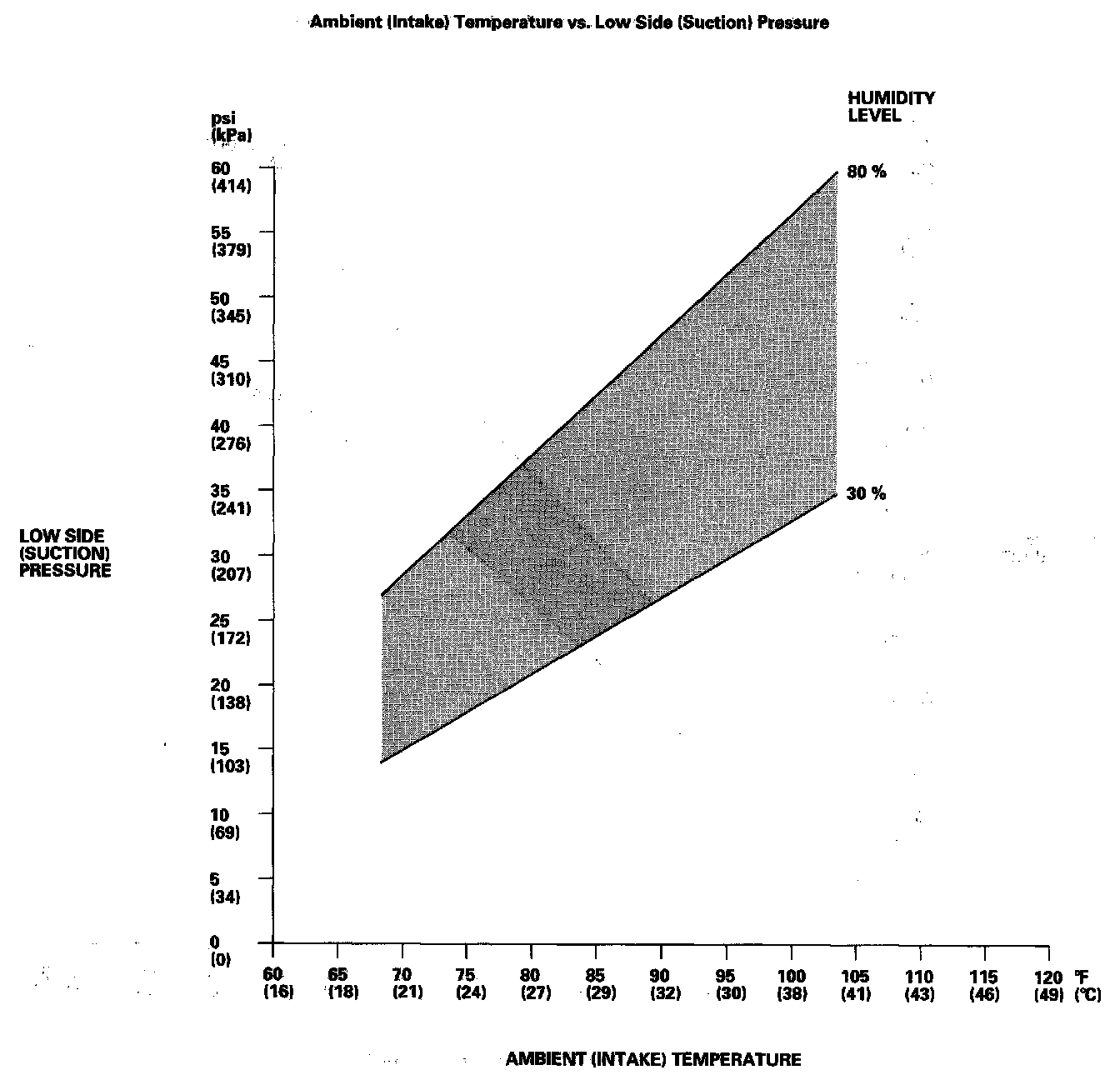 NOTE: The low side and intake temperatures should intersect in the shaded area within about 10% of the measured humidity level. Any measurements outside the line may indicate the need for further inspection.