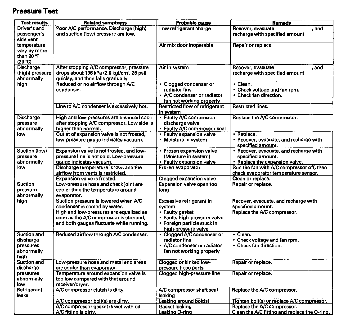 7. After running the air conditioning for 10 minutes under the above test conditions, read the delivery temperature from the thermometer in the center vent, the intake temperature near the blower unit, and the discharge (high) and suction (low) pressures on the A/C gauges.