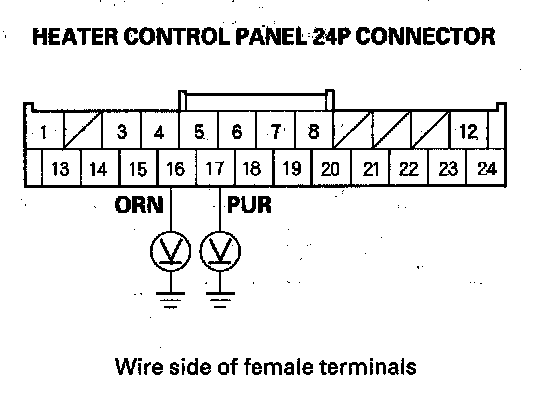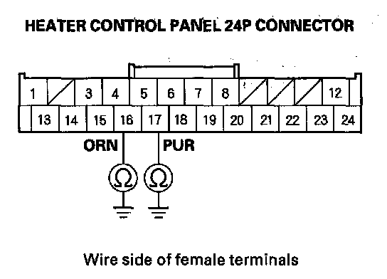 8. Check for continuity between body ground and the heater control panel 24P connector No. 16 and No. 17 terminals individually.