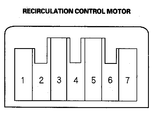 2. Connect battery power to the No. 1 terminal of the recirculation control motor, and ground the No. 5 and No. 7 terminals; the recirculation control motor should run smoothly. To avoid damaging the recirculation control motor, do not reverse power and ground. Disconnect the No. 5 or No. 7 terminals from ground; the recirculation control motor should stop at Fresh (when the No. 5 terminal is disconnected) or Recirculate (when the No. 7 terminal is disconnected). Don't cycle the recirculation control motor for a long time.
